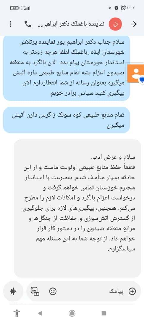 نماینده حوزه با در نظر گرفتن اهمیت حفظ منابع طبیعی و لزوم جلوگیری از گسترش آتش به دیگر نقاط جنگلی و مرتعی، بلافاصله رایزنی با وزارت کشور، سازمان مدیریت بحران و ستاد اطفای حریق منابع طبیعی را آغاز و هماهنگیهای لازم برای اعزام بالگرد اطفای حریق را انجام داد.