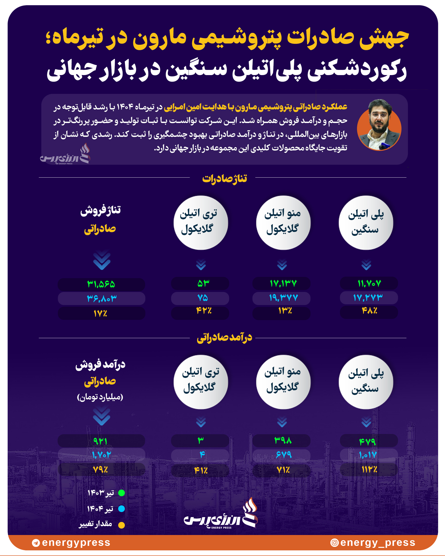 به طور کلی عملکرد تیرماه پتروشیمی مارون حاکی از همافزایی میان رشد حجم صادرات و بهبود نرخ فروش است. رشد قابلتوجه در محصولات کلیدی، بهویژه پلیاتیلن سنگین، جایگاه این شرکت را در بازارهای هدف تقویت کرده و چشمانداز مثبتی برای ادامه سال ایجاد میکند.
