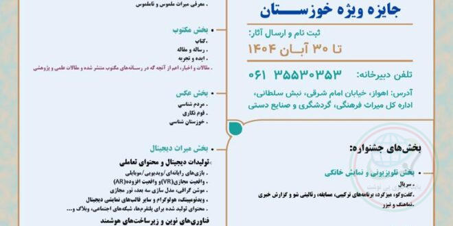 «جایزه ویژه خوزستان» در چهارمین جشنواره چندرسانه اى میراث فرهنگی فراخوان داد. فراخوان «جایزه ویژه خوزستان» در چهارمین جشنواره بینالمللی چندرسانهای میراثفرهنگی در ۱۰ بخش منتشر شد و هنرمندان و صاحبان اثر میتوانند آثار خود را تا سیام آبان ماه ارسال کنند. بهگزارش پی نوشت ، «چهارمین …